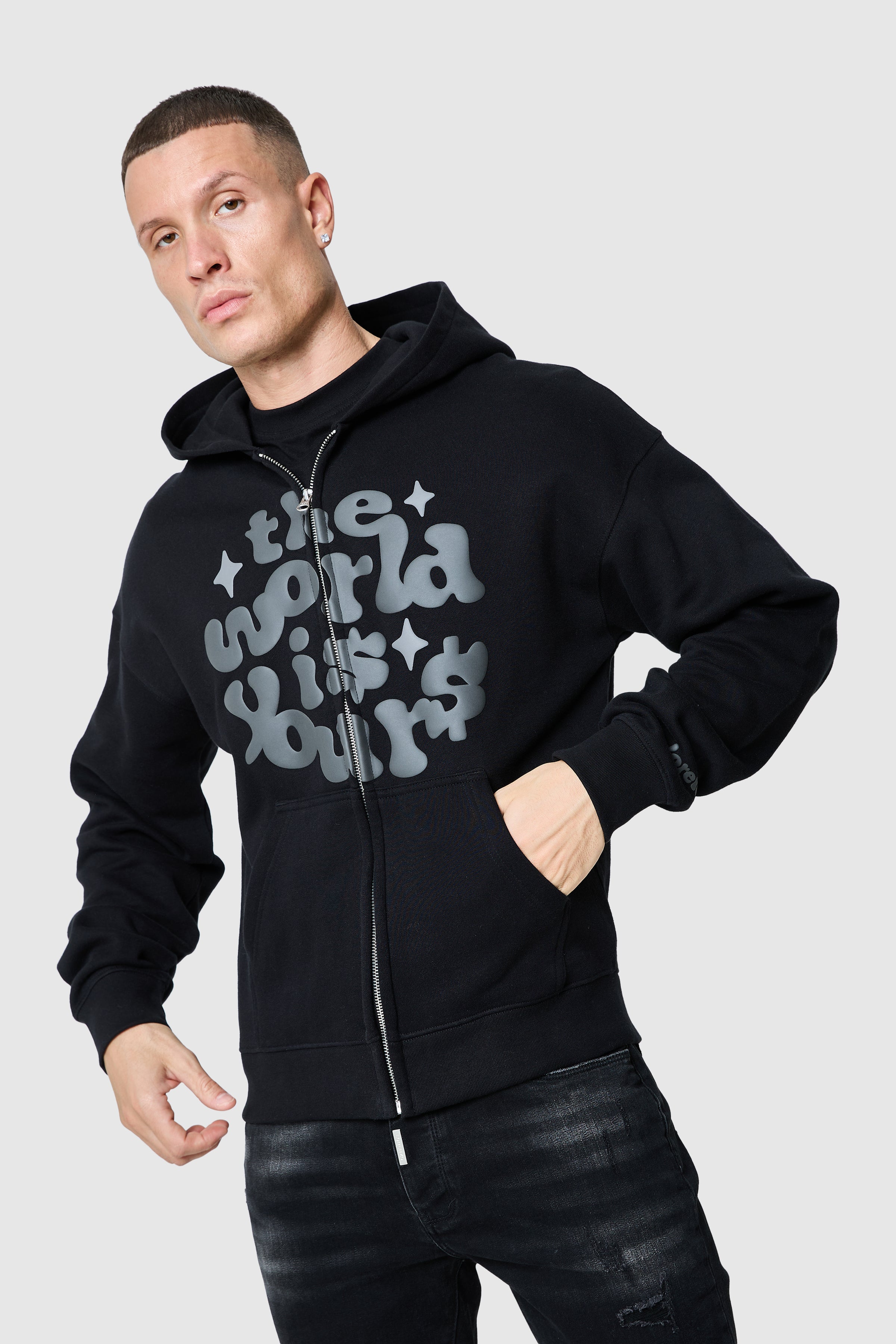 Designed with a relaxed, drop-shoulder fit, the World Is Yours FZ Hood 2.0 offers ultimate comfort with a cotton and polyester blend. Featuring a bold puff print and ribbed cuffs and hem, it pairs perfectly with the matching fleece jogger for a complete look.